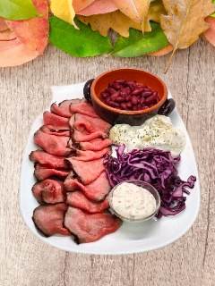girello di manzo omaha americano affumicato al BBQ, servito Con Coleslaw, Insalata Di Patate, Fagioli alla messicana e salsa tiger (maionese, senape e rafano) 1,3,6,7,11,13