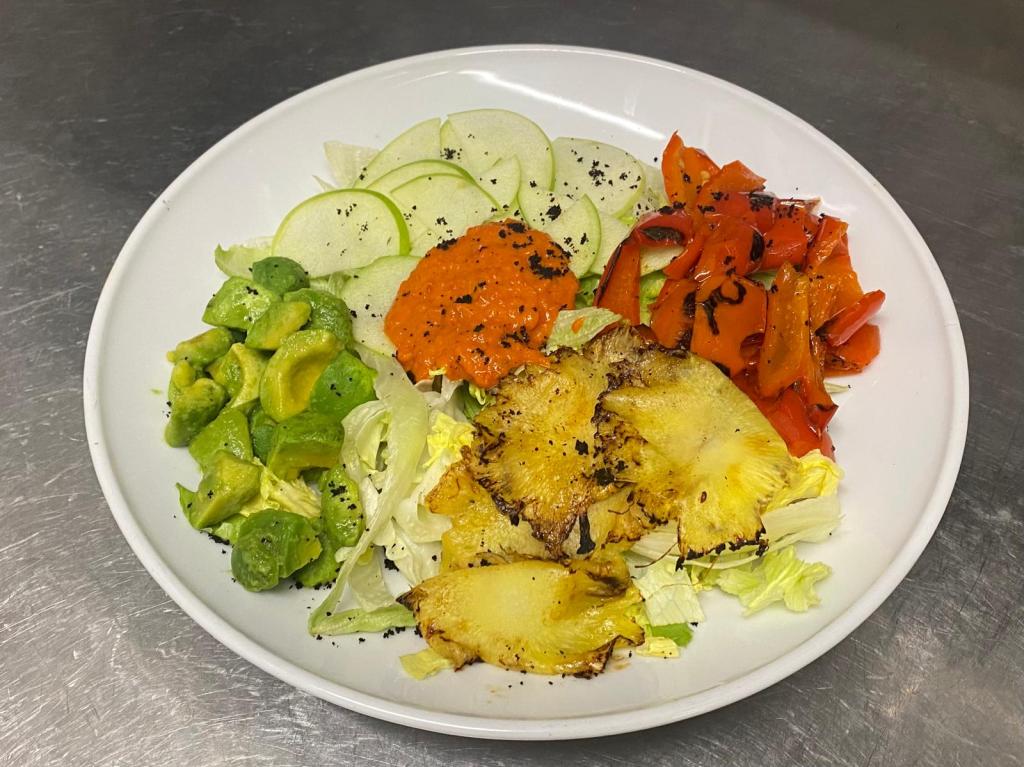 Insalata, Peperoni Grigliati, Ananas Grigliato, Salsa Mojo Rojo, Mela Verde, Avocado e Polvere Di Olive.